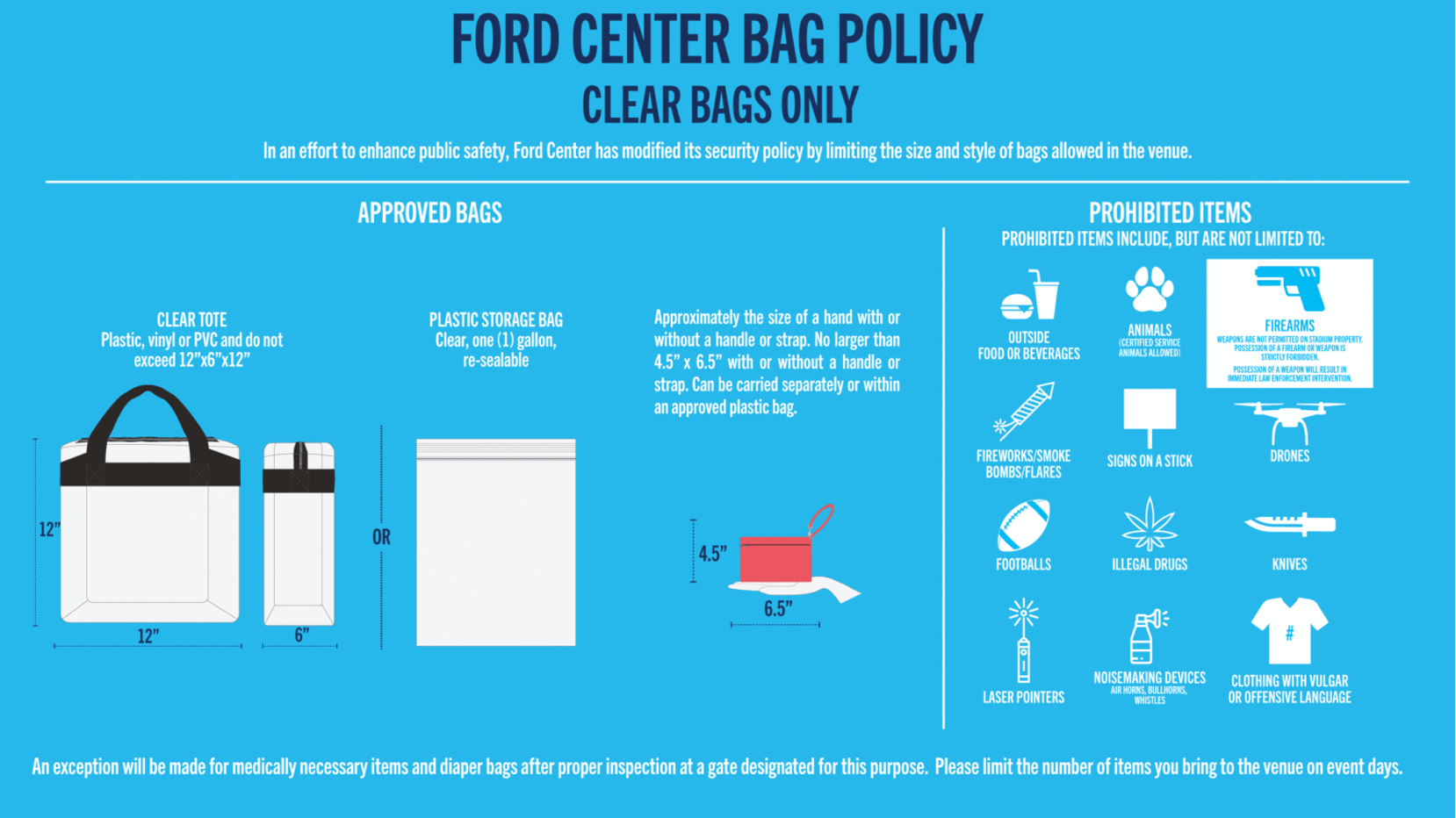 Fans may carry only the following style and size bag, package, or container at the plaza areas, gates, or when approaching queue lines of fans awaiting entry into Ford Center: